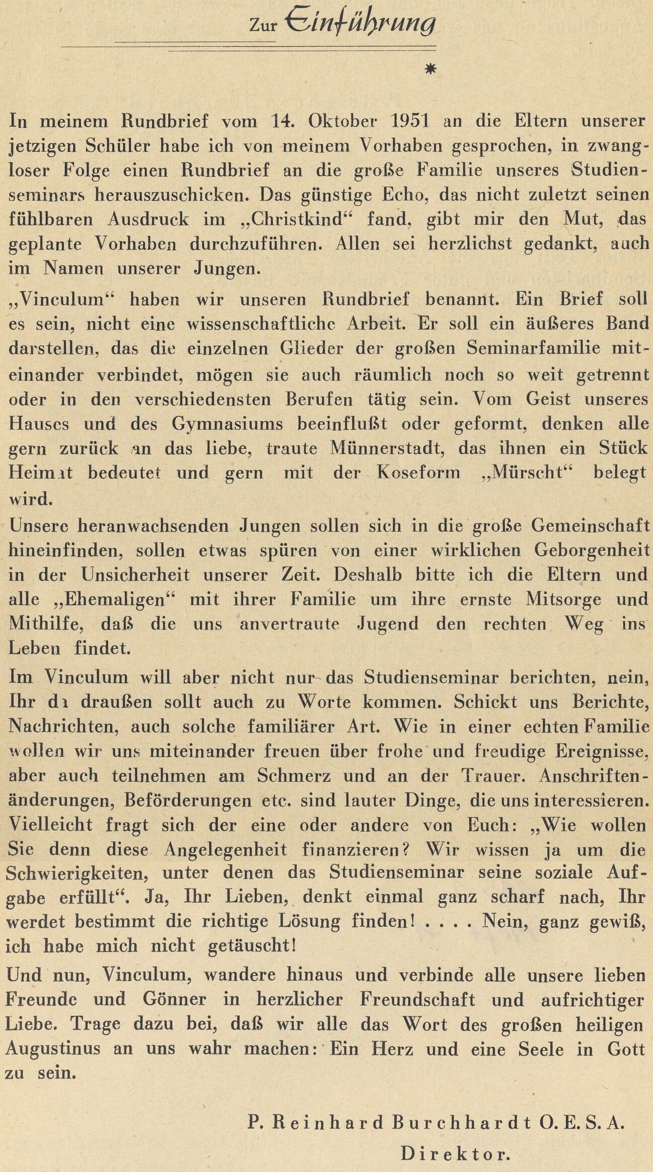Unser Vinculum blickt mittlerweile auf eine über 70-jährige Tradition zurück. Als Pater Reinhard Burchardt, von 1950 bis 1953 Direktor des Studienseminars, im Dezember 1951 das Vinculum aus der Taufe hob, war es zunächst gedacht als Mitteilungsblatt und Rundbrief für die ehemaligen Internatsschüler des Münnerstädter Studienseminars. Seine Einführung zur allerersten Ausgabe endete mit den Worten: